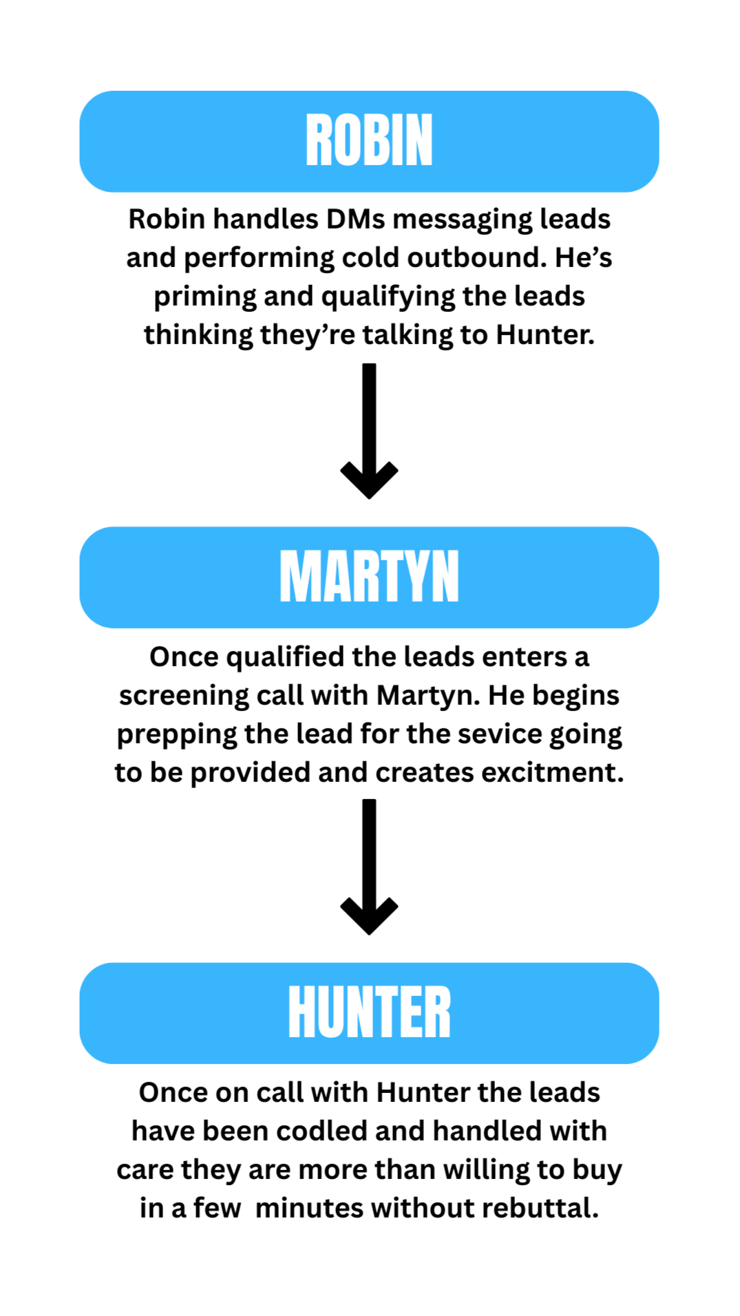 Higher Level Coaching is a social media based coachign business. The funnel is designed to take the leads through a joinery. From consuming content and engaging with the page, to thinking they’re DMing Hunter and feeling personally cared for, the prospect eventually gets on a screening call with Martyn, who pre-sells them on the offer—ending with Hunter as the final touchpoint, making the sale seamless. The leads are taken through a whole care process, making them feel indevidually cared for and special. As if they were the ONLY lead. The process does include form and a sort of application in addition to human touchpoint and attention. The lead is never left to complete their own sales process.